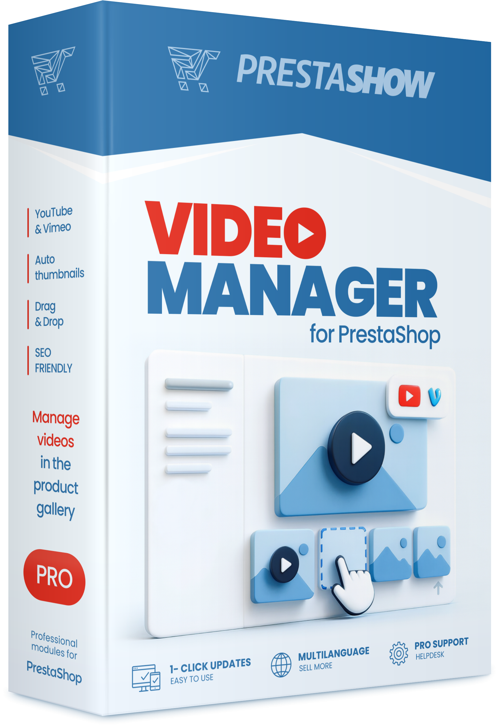 Moduł umożliwia płynną integrację filmów z serwisów YouTube i Vimeo w galerii produktów. To kompletne rozwiązanie do zarządzania filmami, automatycznym generowaniem miniatur i responsywne wyświetlanie wideo w galerii - wraz z zdjęciami produktu.