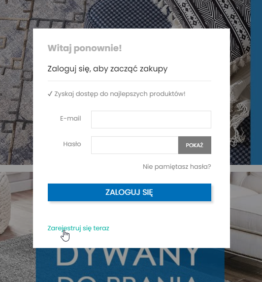 Po wejściu do sklepu użytkownik zobaczy POP-UP z formularzem logowania, przypomnienia hasła oraz linkiem do rejestracji konta.